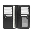 - Lightweight and Compact: Slim profile fits seamlessly into any bag without adding bulk, featuring a button snap closure, 12 card slots, four bill slots, a clear ID window, and a back zip compartment.