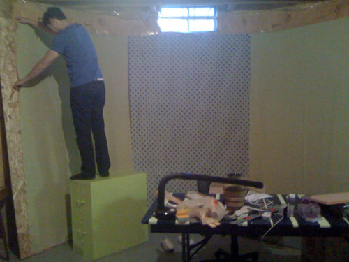 Setting up "walls" on unfinished basement for our first office.